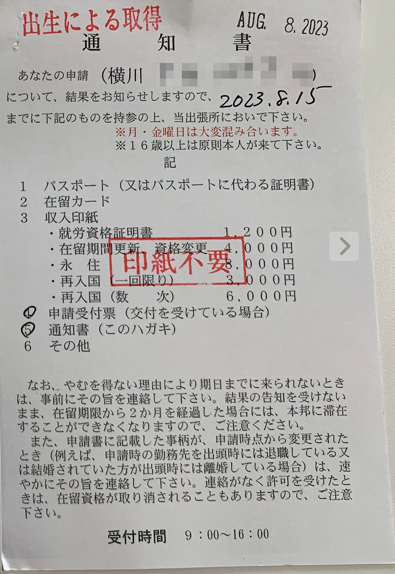 신생아의 영주권은 성인과 달리 인지세(印紙)가 필요없습니다. 「印紙不要」 문구를 보고 "설마 떨어졌나?" 하며 불안해하지 마시길..